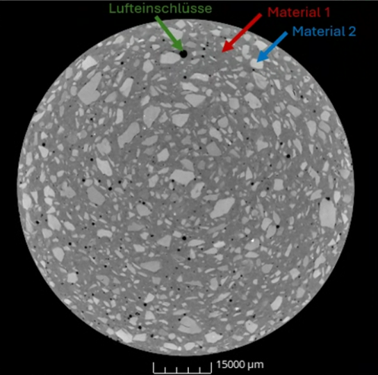 Průřezové snímky generované pomocí výpočetní tomografie jasně ukazují různé materiálové fáze jílu a oxidu hlinitého, stejně jako vzduchové bubliny: