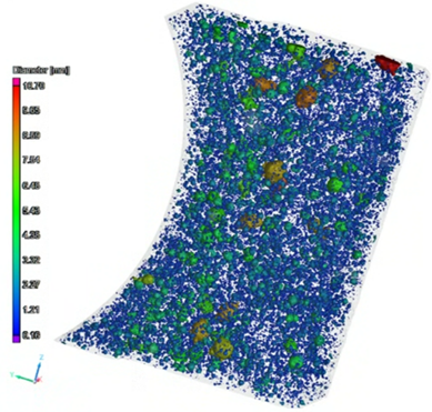 Trojrozměrná data generovaná pomocí výpočetní tomografie umožňují kvantifikovat vzduchové inkluze ve vzorcích a stanovit procentuální poréznost. Výsledky výzkumů ukázaly, že poréznost ve vzorcích se pohybovala od méně než 0,05 % ve vzorku 3 do 3,8 % ve vzorku 2. Vzorek šamotové hlíny zobrazený na obrázku 2 má tedy nejvyšší poréznost, a tedy pravděpodobně i nejnižší účinnost akumulace tepla.